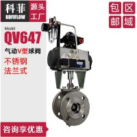 气动V型球阀QV647H 304 316L不锈钢法兰快速切断 气动V型球阀Pneumatic V-Type Ball ValvesKFF科菲气动V型球阀属于固定球阀,也是单阀座密封球阀,调节性能是球阀中最佳的,流量特性是等百分比的,在阀门动作过程中球面始终与阀座紧贴,具有剪切和自洁作用;小开度时V/U型切口可实现微小流量的调节,最大程度提高了可调比。由于本身具有自清洁作用,所以该产品不仅适用于清洁介质,还特别使用于含纤维、细颗粒、料浆类介质,可用于大可调比的控制系统,具有磨损小、密封性能优越、